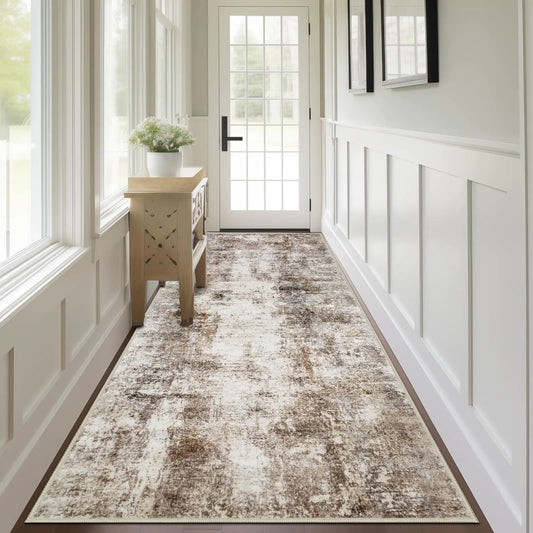 Abstract Washable Runner Rug – 2.6x8 Modern Brown Non-Slip Hallway Carpet, Low Pile Ultra-Soft Distressed Print for Entryway, Kitchen, Bedroom, Living Room
