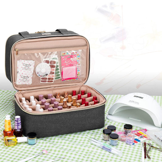Nail Polish Organizer Case – Portable Dual-Layer Storage with Resizable Bottle Divider and Nail Lamp Space