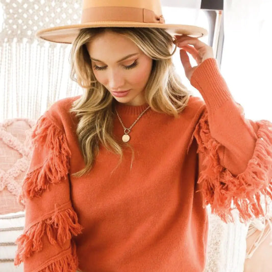 Tassel Sleeve Knitted Sweater – Soft Orange Knit with Diagonal Fringe Detail (S–L)