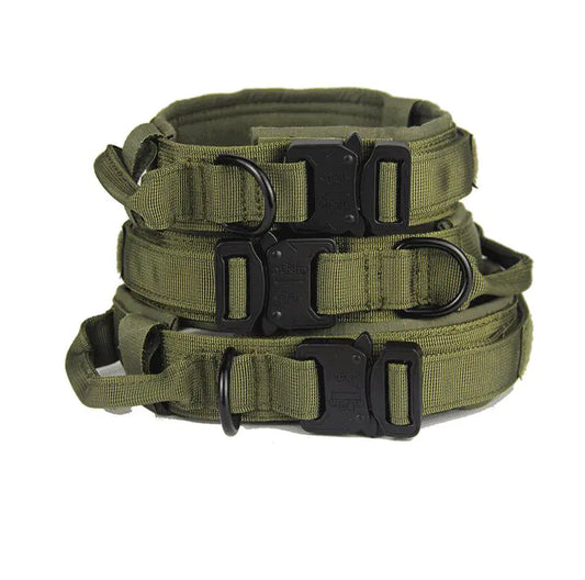 Tactical telescopic dog leash and collar set for training and outdoor walks. Adjustable length, durable build. Sizes M–XL for dogs 28–90 lbs.