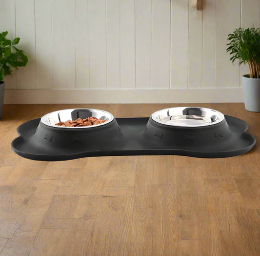 Bone-Shaped Silicone Pet Bowl Mat with Stainless Steel Bowls