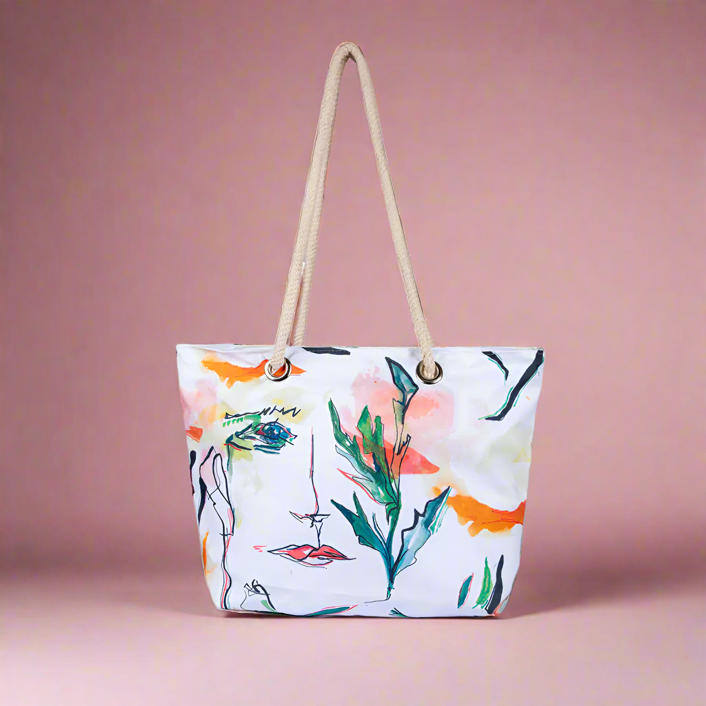 White Faces Beach Bag – Artistic print tote with tapestry straps and zippered pocket. Spacious, durable, and perfect for summer beach or travel use.
