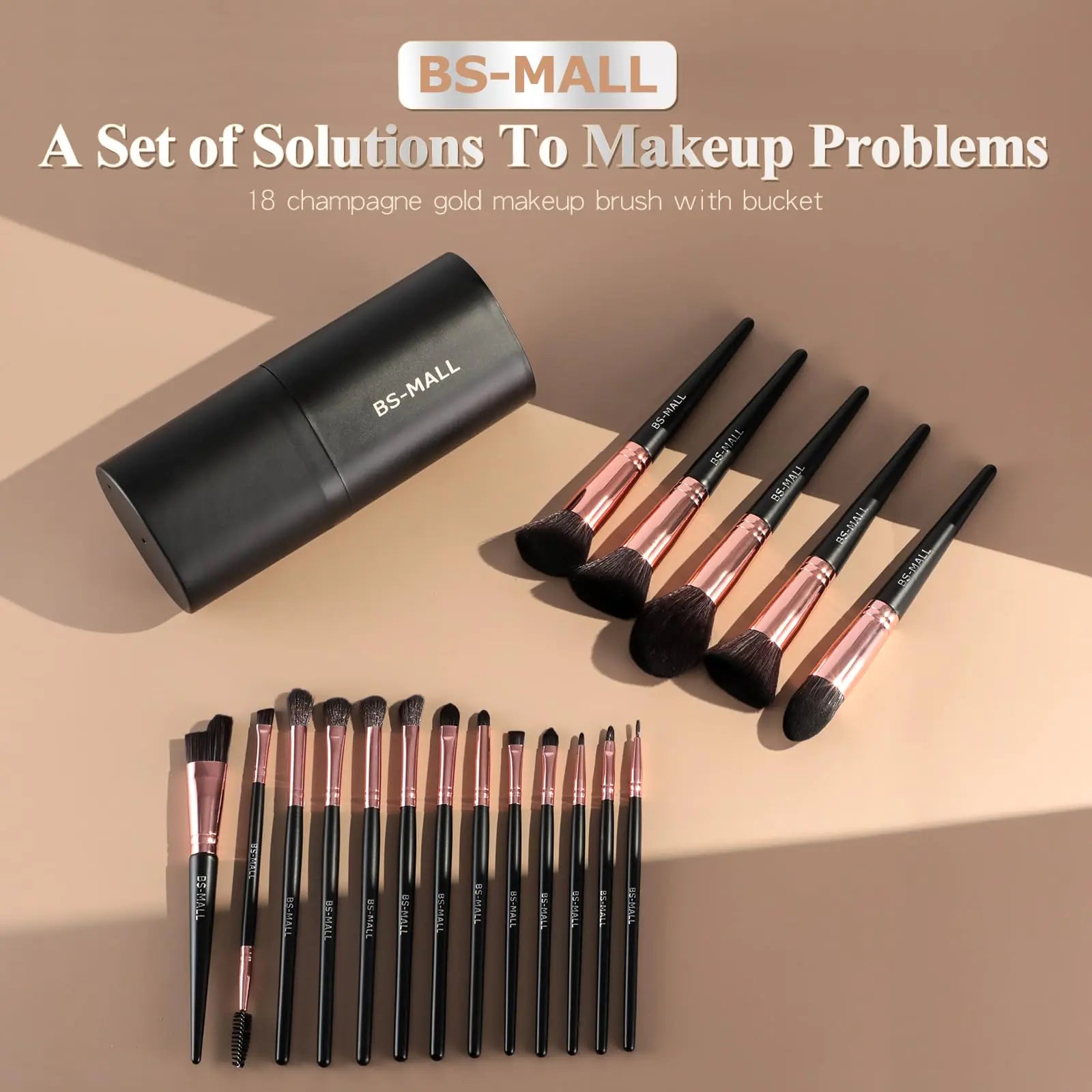 18-Piece Makeup Brush Set with storage bucket in black & rose gold. Premium synthetic brushes for flawless foundation, powder, eyeshadow, brows, and more.