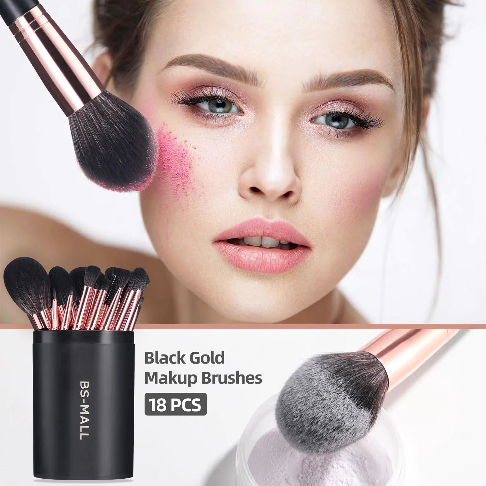18-Piece Makeup Brush Set with Storage Bucket (Black & Rose Gold, Professional Synthetic Bristles)