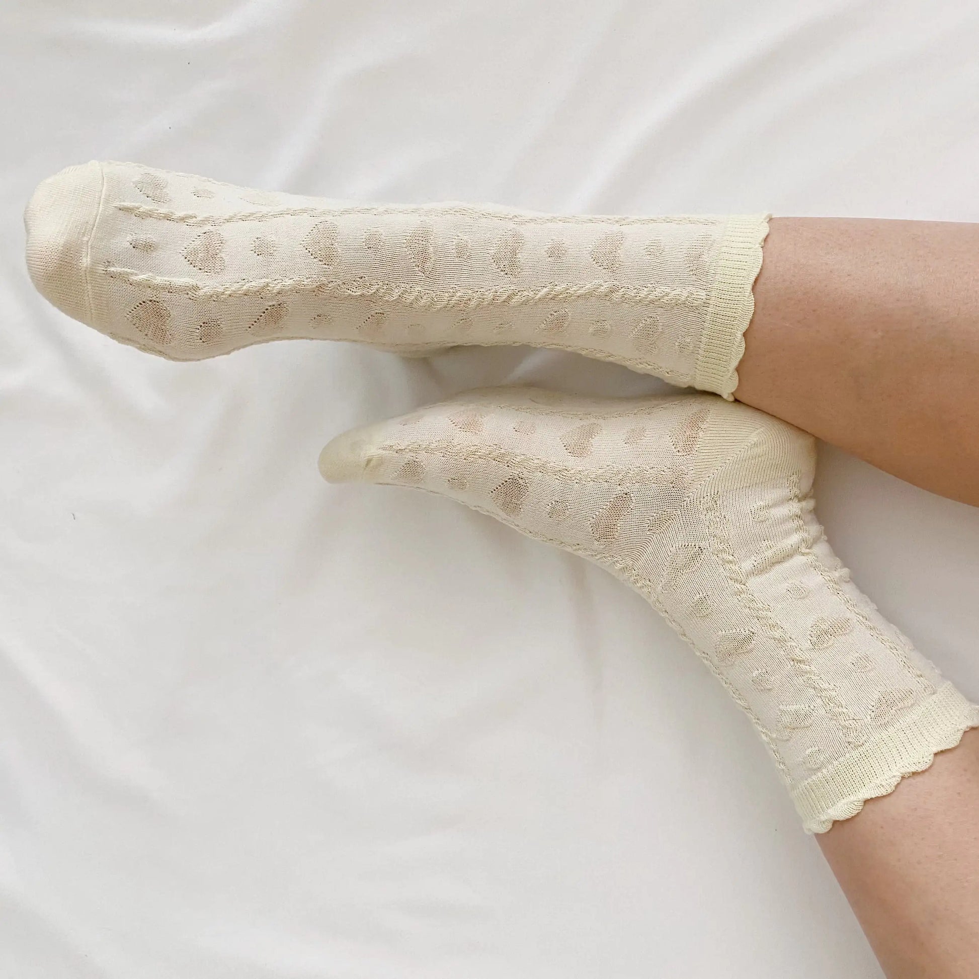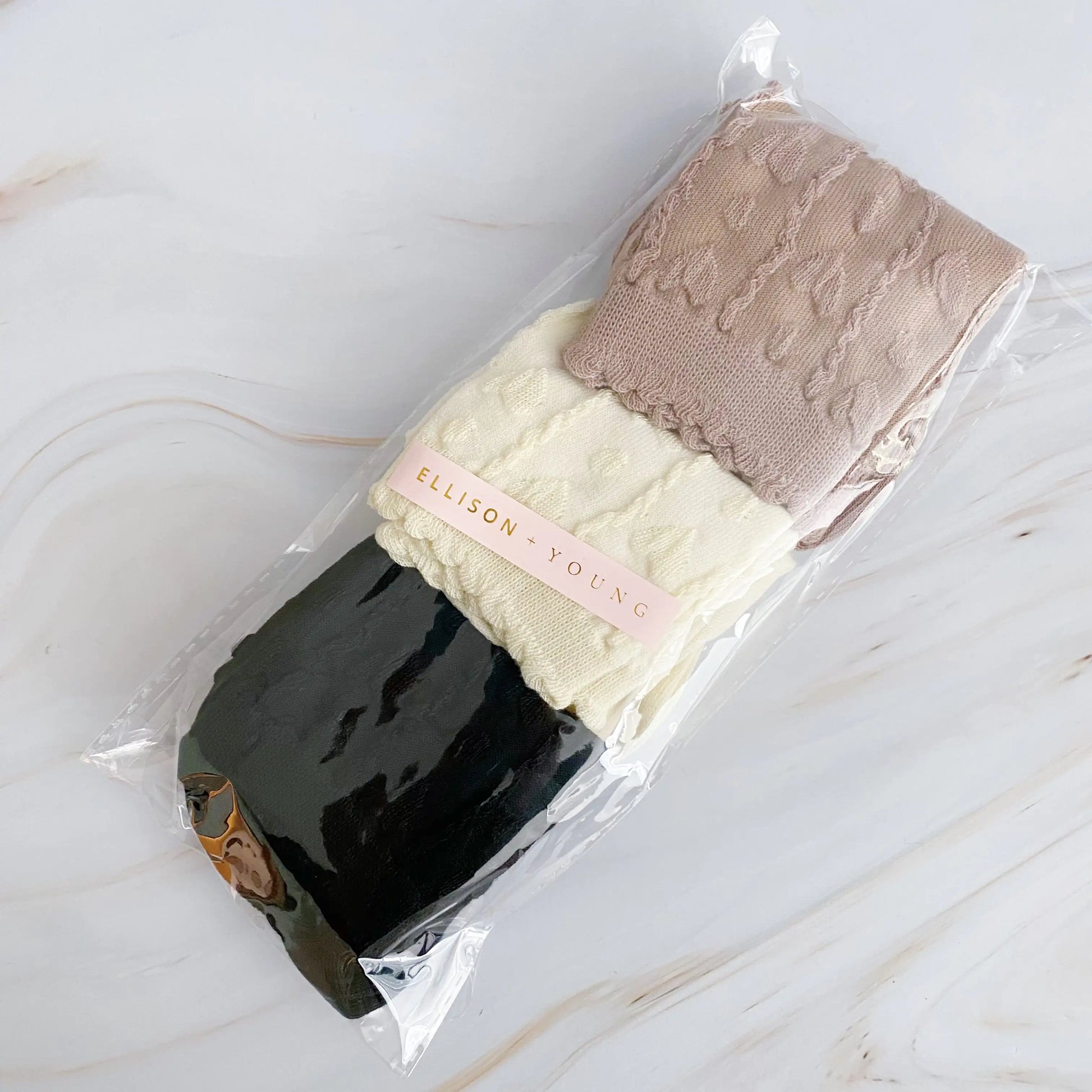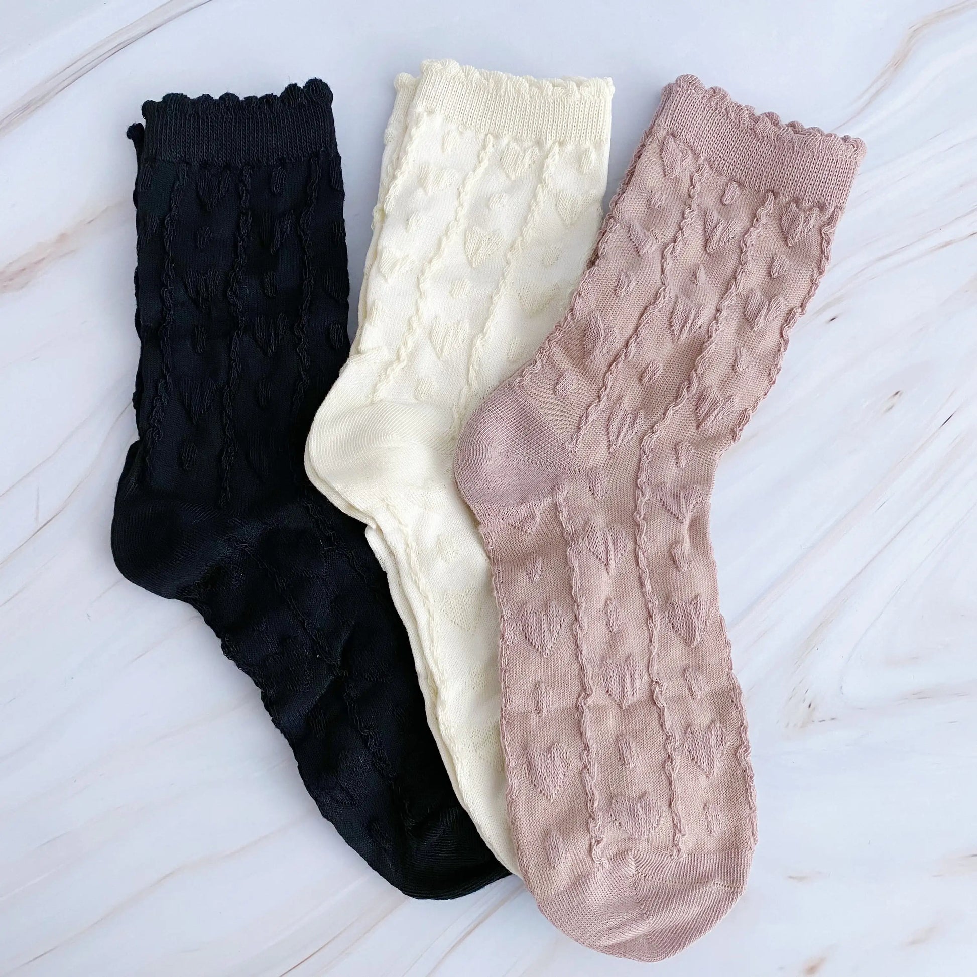 Enhance any outfit with our Heart Embossed Socks Set Of 3. Made with a subtle yet classic heart embossed design, these socks are perfect for everyday wear or adding a touch of elegance to any ensemble.