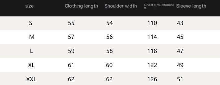 Size | Clothing Length | Shoulder Width | Chest Circumference | Sleeve Length |