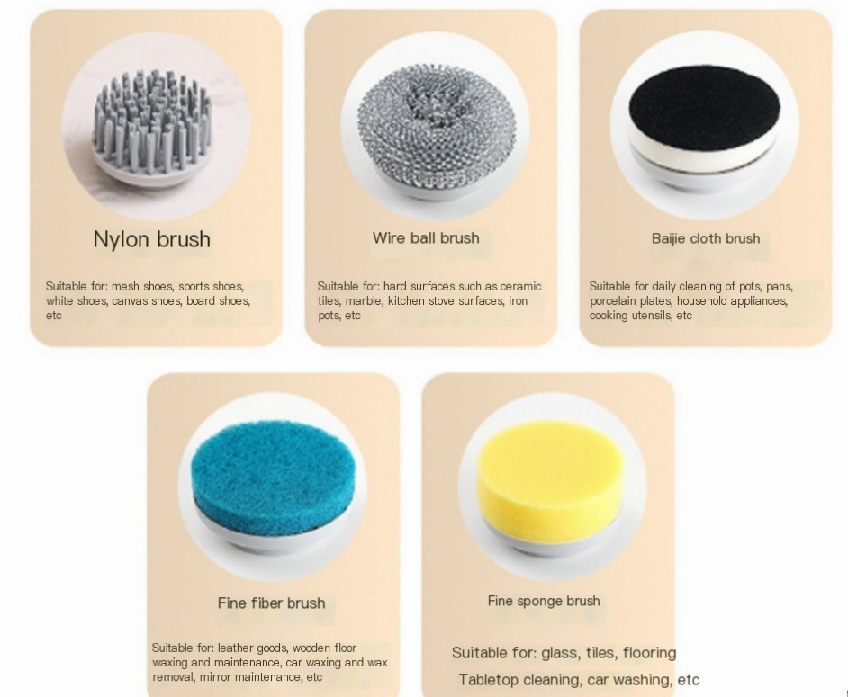 Comes with five interchangeable brush heads—nylon, wire ball, cloth, fine fiber, and sponge—designed for specific cleaning needs. From scrubbing pots and pans to polishing glass or detailing leather, each head ensures the right tool for every task.