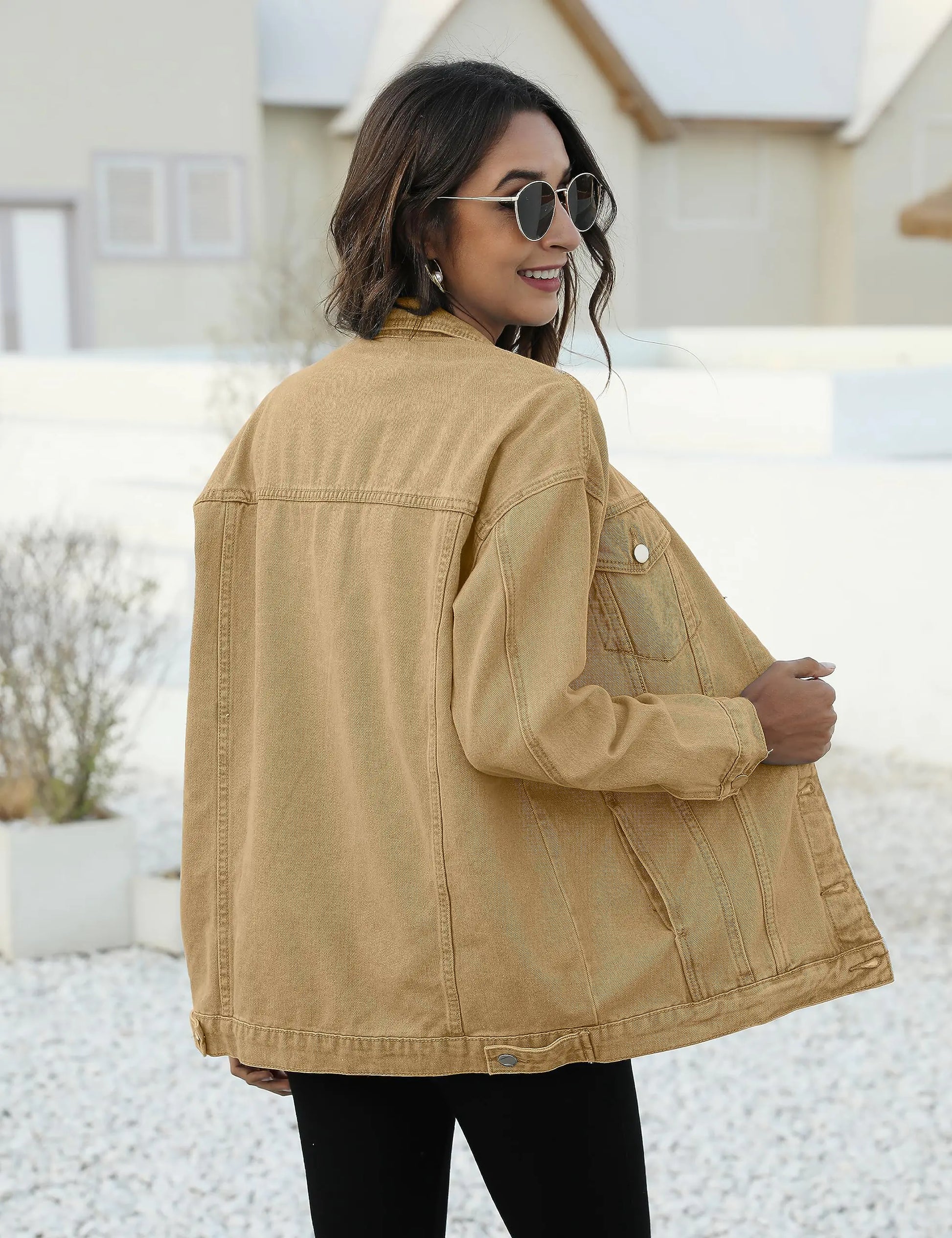 Omoone Women's Oversized Mid Long Denim Jacket Jean Biker Coat Small Khaki