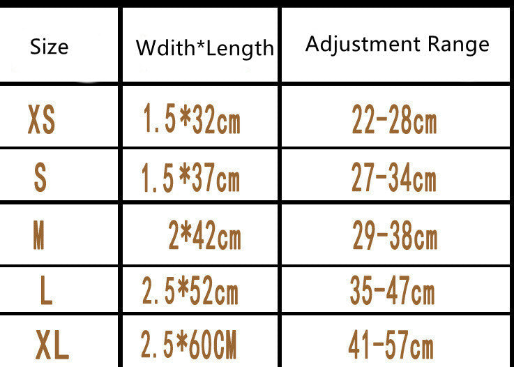 XL | 2.5 cm × 60 cm | 41–57 cm (16.1–22.4 in) |