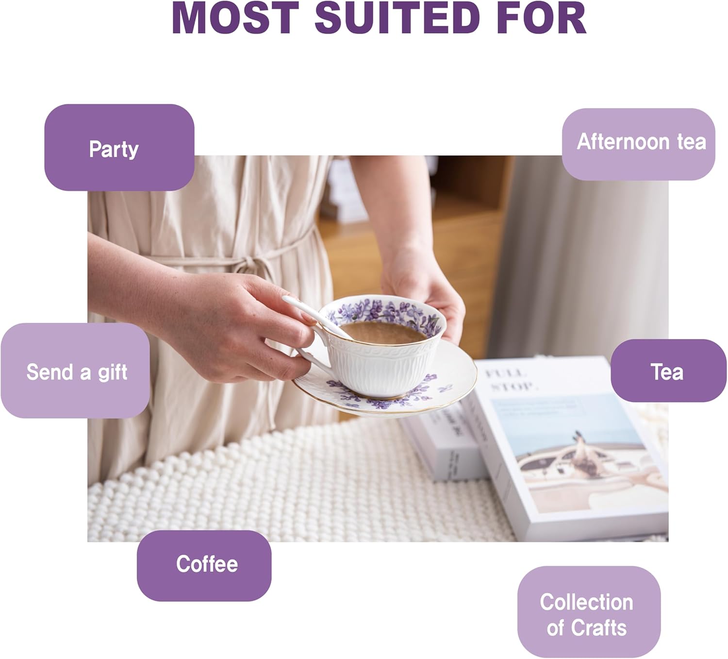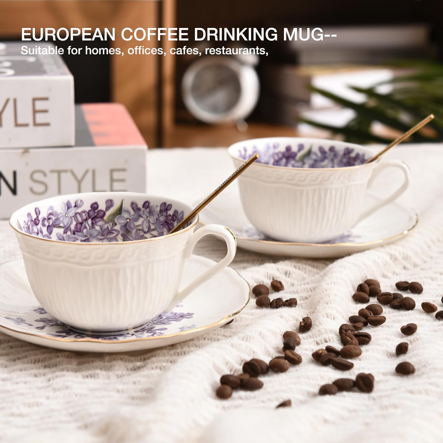 The intricately painted lilac floral design captures vintage elegance while the high-gloss glaze and radiant gold detailing add a touch of luxury. Each cup is ergonomically designed for comfortable sipping, paired with a coordinated saucer and matching gold-trimmed spoon. Whether you’re enjoying a cappuccino, herbal tea, or espresso, this set combines beauty and function effortlessly.