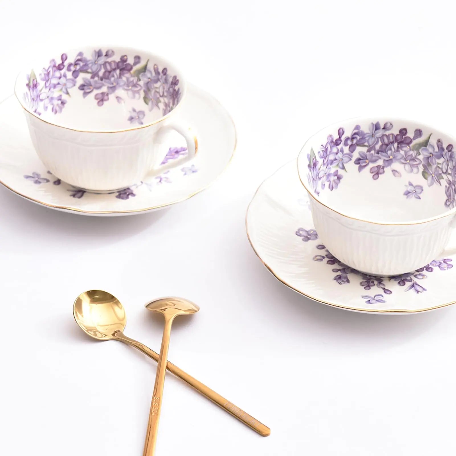 Vintage lilac bone china tea cup and saucer set with gold trim. Includes 2 cups, saucers, spoons, and gift box. Elegant, durable, and perfect for gifting.