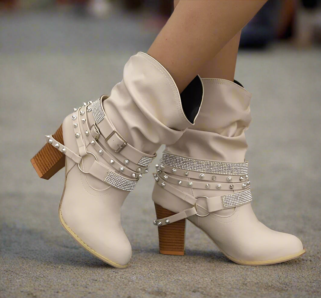 Adorned with stylish straps, studs, and rhinestones, these boots deliver a touch of glam with every step. The decorative accents make them stand out in the crowd, perfect for country concerts, weddings, or city strolls with flair.