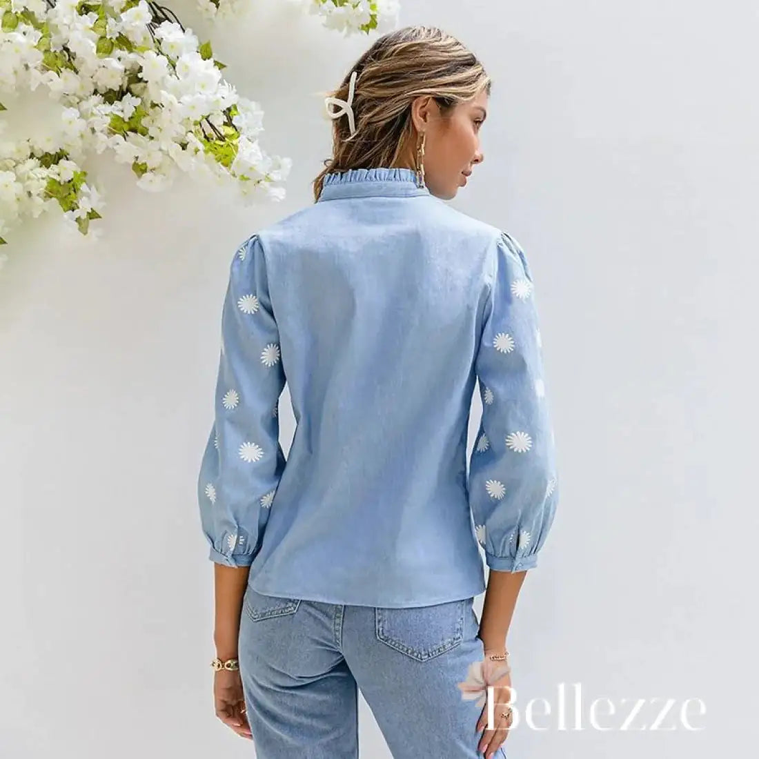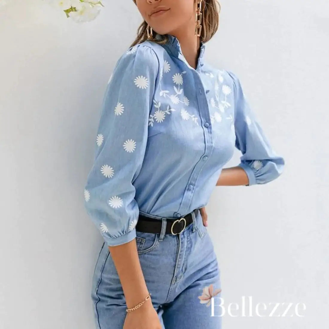 Spring and Autumn Denim Blue Lace Shirt – Effortless Elegance for Every Occasion