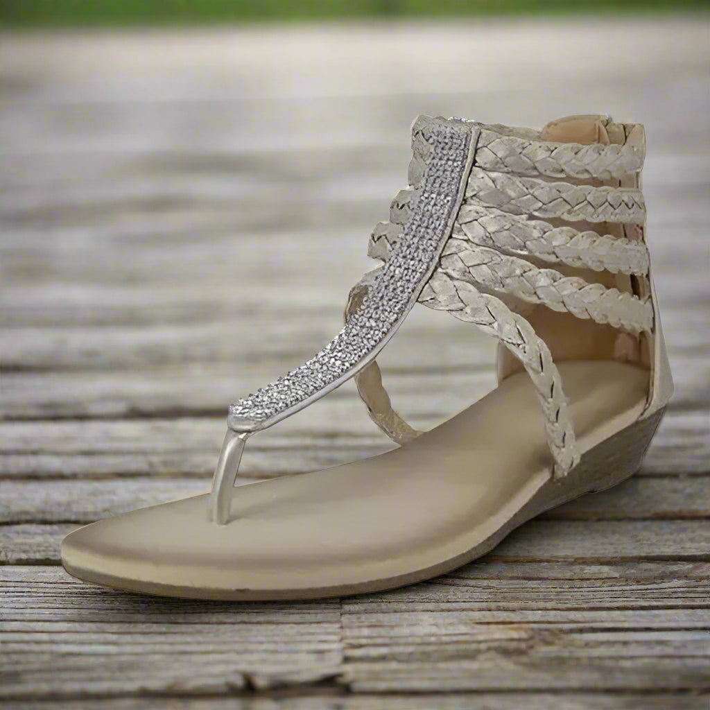 Step into timeless glamour with the Ivory Braided Rhinestone Gladiator Sandals—where bold elegance meets effortless comfort.