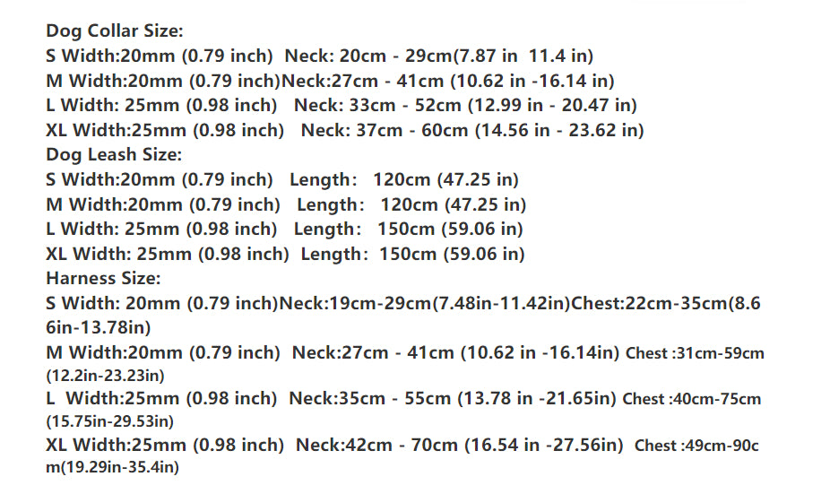 XL: Neck 16.54–27.56", Chest 19.29–35.4" (42–70 cm / 49–90 cm)