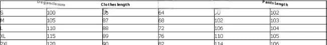 | Size | Bust (in) | Clothes Length (in) | Sleeve (in) | Pants Length (in) |