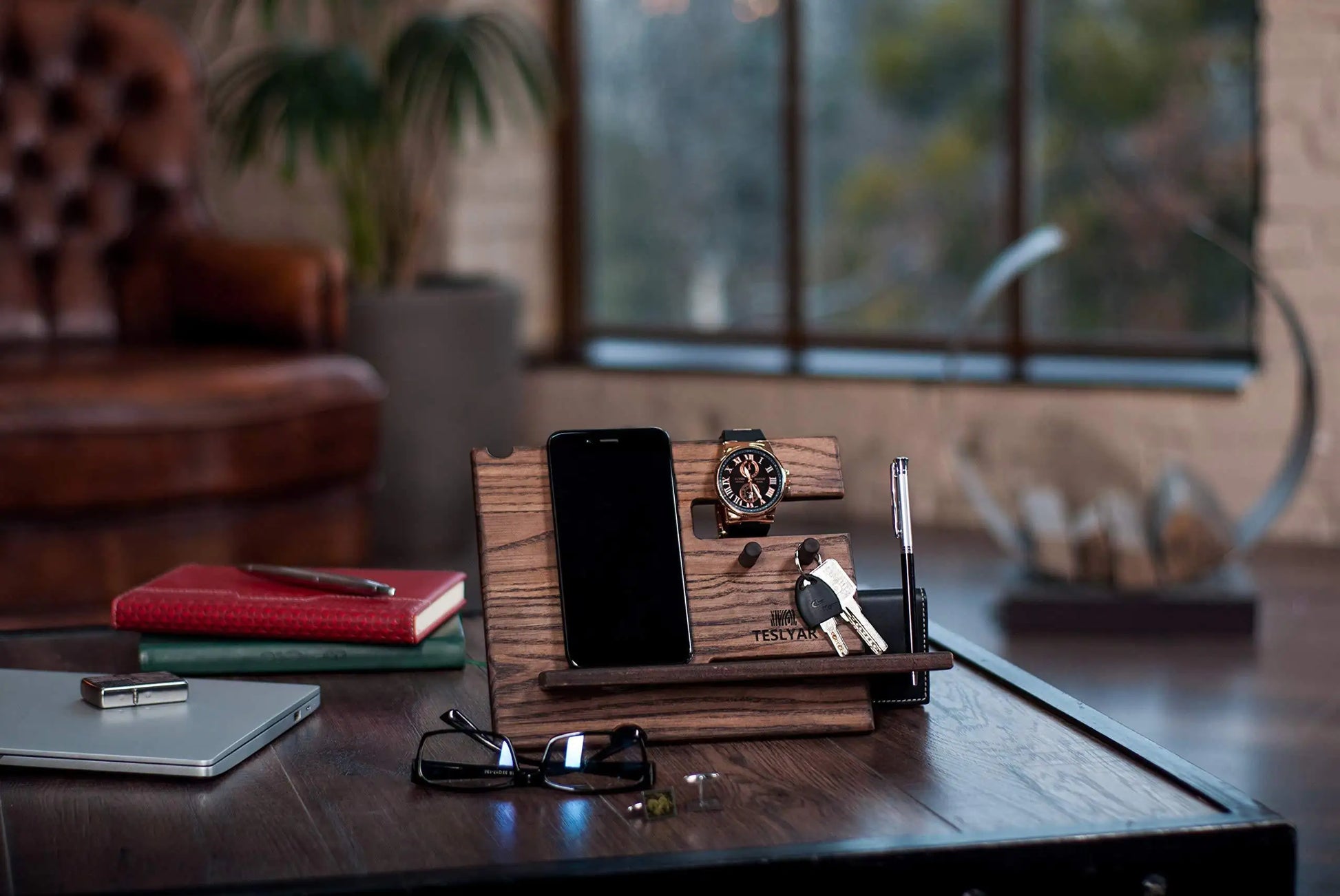 Wood Phone Docking Station – Ash Key Hooks, Wallet Stand, and Watch Organizer for Men