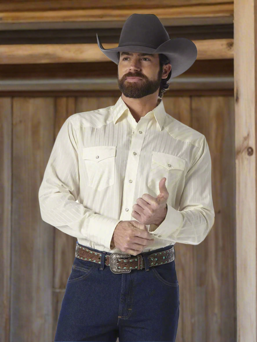 Men’s Sport Western Snap Shirt in light tan with two chest pockets and snap closure. Comfortable, stylish, and perfect for casual or workwear looks.